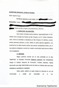 Según supo Noticias Argentinas a partir de una publicación del sitio del periodista Ricardo Benedetti, la denuncia fue formalizada en la fiscalía por el excandidato a intendente de Mar Chiquita, Cristian León, y la concejal Patricia Heltner. Afirman tener «testimonios, documentos y audios» que prueban la maniobra.
